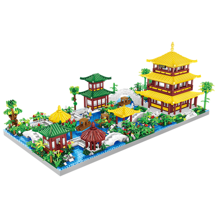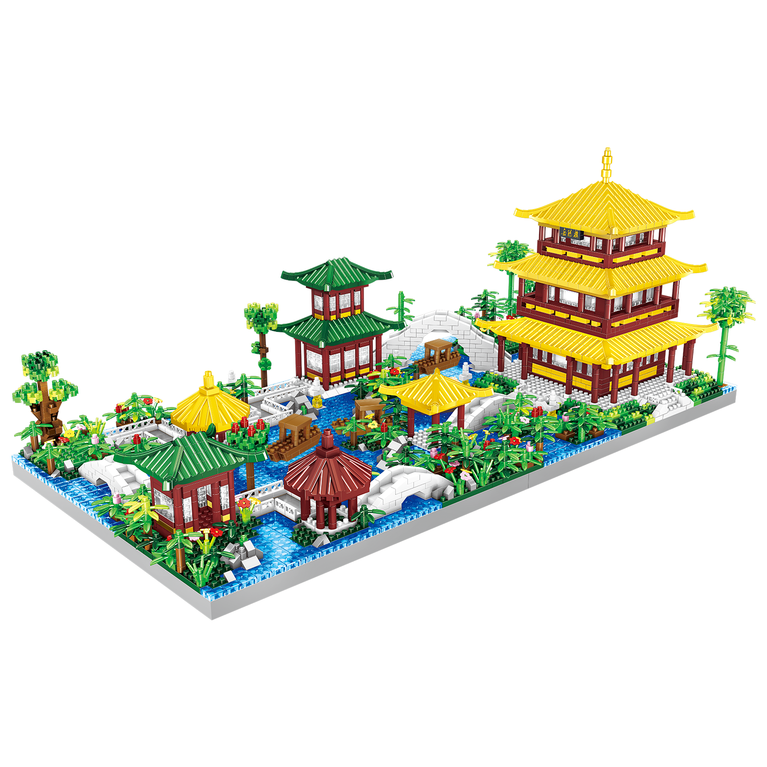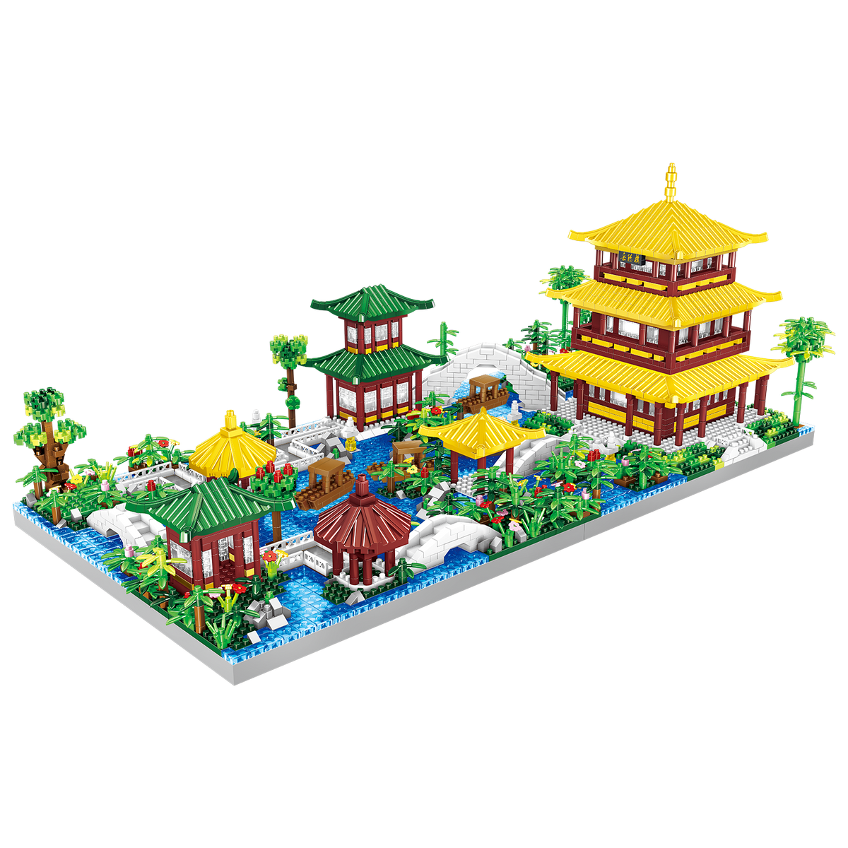 Hilfe! Wo sollen wir anfangen, um Ihnen dieses unglaublich coole Kunststoff-Bauset vorzustellen? Beginnen wir mit dem auffälligsten gelben Turm mit drei Etagen auf braunen Säulen? Oder mit den braunen Sampans, die gemütlich in den Bächen und Teichen unter den Brücken hindurchfahren? Oder sollen wir zuerst von dem exotischen Garten mit hohen Bäumen und rosa, roten und gelben Blumen erzählen? Es gibt einfach zu viele Details, um diesen großartigen Garten in ein paar Sätzen zu beschreiben. Kurz gesagt, beim Dongting-Komplex spazieren Sie entlang des Wassers über Wege, die durch kleine Tempel verbunden sind.