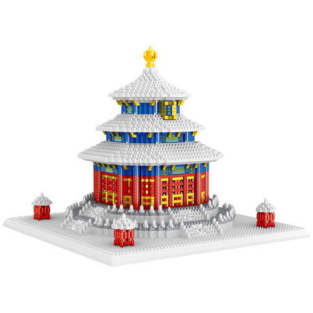 Was für ein wunderschöner bunter Bausatz für Erwachsene ist dieser Himmlische Tempel! Das große Gebäude besteht aus drei Etagen, hauptsächlich aus roten und blauen Miniblocks. Vier Plattformen in alle Himmelsrichtungen führen ins Innere. An jeder Ecke des Geländes steht ein roter Tempel. Die Dächer des Gebäudes sind schneebedeckt und die Dachstützen sind goldfarben. Ganz oben auf dem Dach thront eine schöne goldgelbe Verzierung. Dieser Tempel befindet sich in Peking und wurde um das Jahr 1420 von den Kaisern der Ming-Dynastie erbaut. Und Sie werden ihn jetzt bauen!