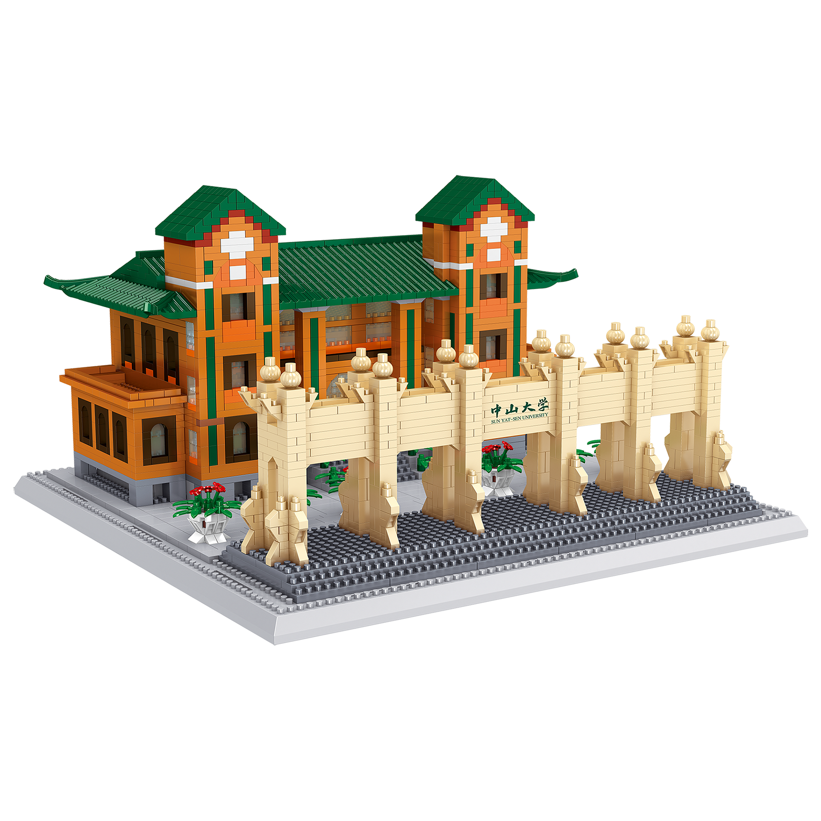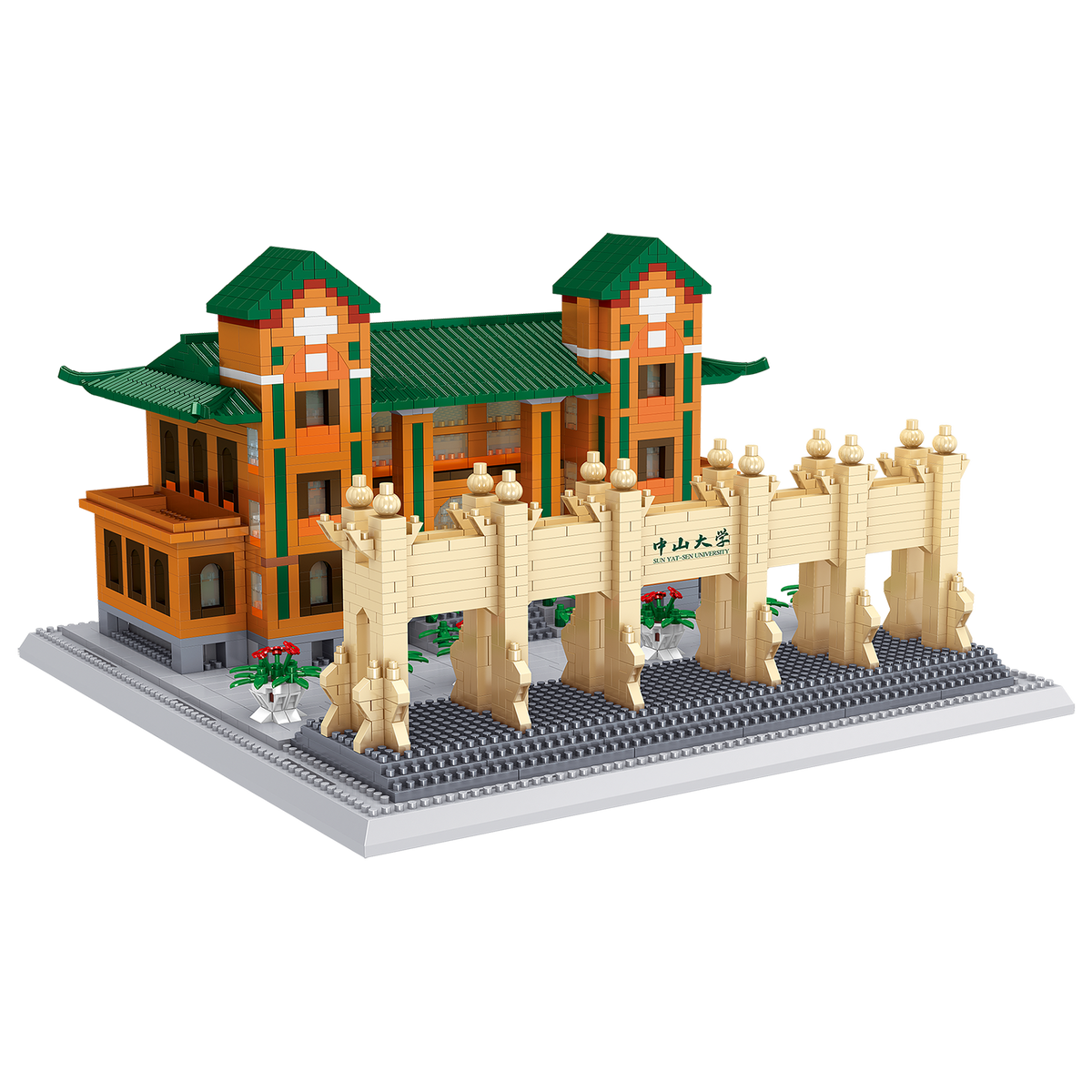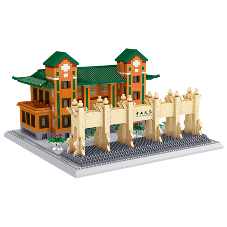 Ihr Bausatz wird 24 Zentimeter breit und 15 Zentimeter hoch sein, das echte Tor ist in Wirklichkeit etwa 15 Meter hoch. Dieses Tor befindet sich an der Nordseite der Universität. Das Gebäude mit den grünen Dächern ist die Blackstone Lodge. Die Universität wurde 1924 von Sun Yat-sen gegründet, daher trägt sie auch diesen Namen. Etwa 50.000 Studenten besuchen hier Vorlesungen und werden von 17.000 Mitarbeitern betreut. Universitäten sind großartig, um sie aus Nanoblocks zu bauen. Schauen Sie in unserer Kategorie Gebäude nach noch mehr berühmter Architektur. Dies ist ein Bausatz für Fortgeschrittene. Für Anfänger haben wir zum Beispiel kleinere Sets.