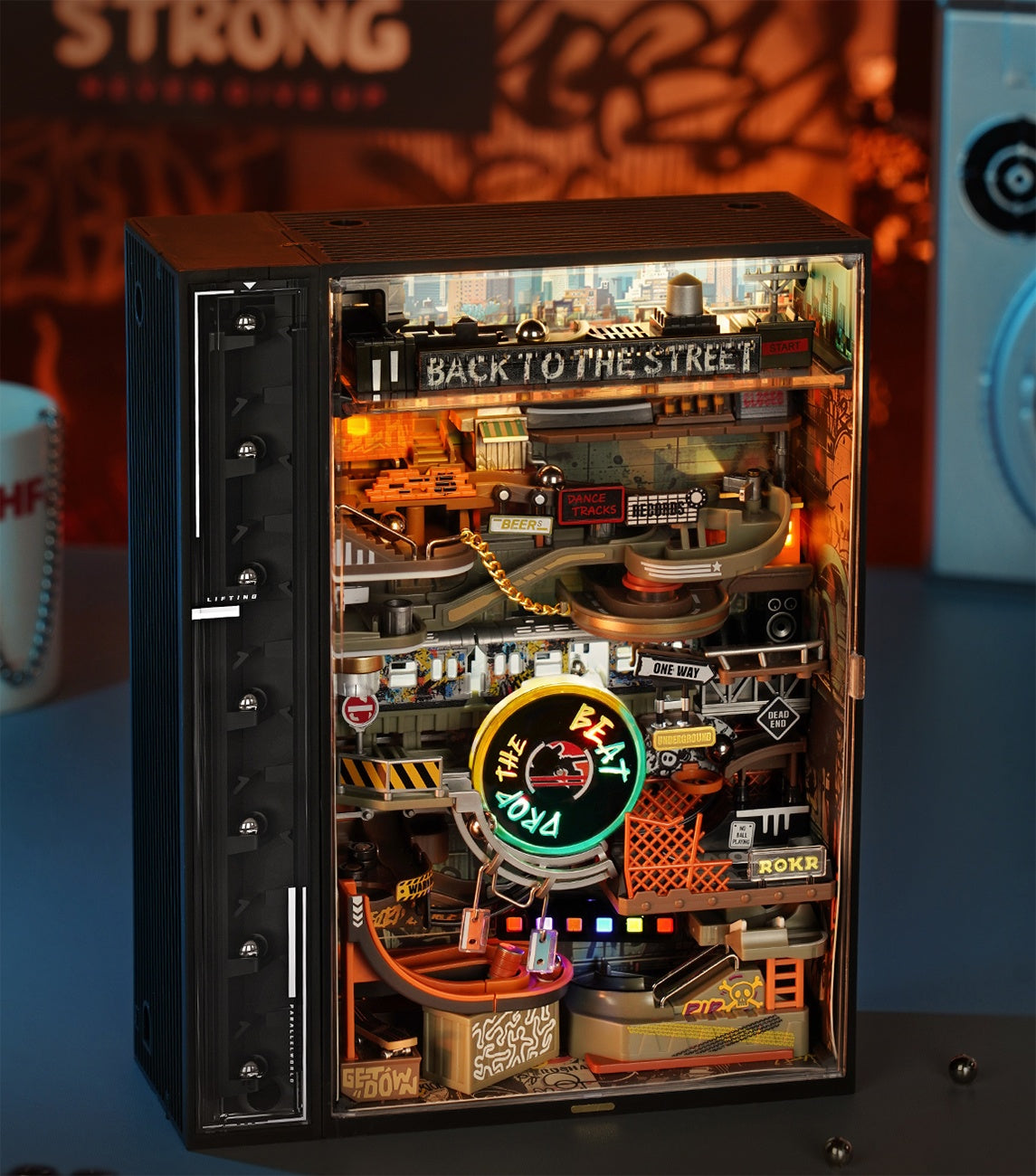 Wollen Sie eine Welt voller Rhythmus und Technik erschaffen? Dann ist die ROKR Hiphop Street Murmelbahn das ultimative Bauprojekt für alle, die Gadgets, Musik und Design lieben. Sobald Sie mit dem Bauen beginnen, tauchen Sie in die Atmosphäre einer lebendigen Straße voller Farbe, Beats und Bewegung ein. Ein drehender Plattenspieler, ein kunstvolles Stadtdekor und Murmeln, die durch eine leuchtende Stadt rasen – dieses Modell sprüht vor Geschwindigkeit! Es ist nicht nur Dekoration, sondern Ihr eigenes Stück urbaner Kunst, das zum Leben erwacht. Lassen Sie die Lichtmodule im Takt Ihrer Lieblingsmusik tanzen!