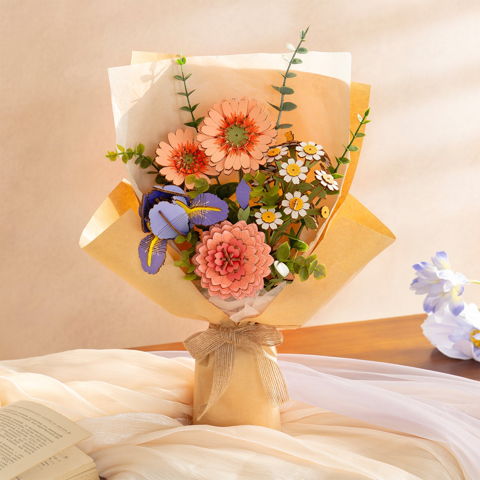 Auch das Basteln dieser Holzblume ist ein wunderbares Erlebnis. Mit einem Schwierigkeitsgrad von zwei Sternen ist dieses Projekt entspannt und superleicht. In etwa anderthalb Stunden setzen Sie 73 Teile ohne großen Aufwand zusammen. Dank der Snap-Fit-Verbindungen lassen sich alle Teile einfach zusammenstecken. Sie drücken die Teile aus Holz- und Pappplatten aus, falten die Vase selbst und benötigen keinen Klebstoff. Die spezielle Lasertechnik gibt Ihnen die Freiheit, die Blütenblätter nach Belieben zu biegen. Dank der kompakten Größe von 100 x 90 x 220 mm findet sie überall einen Platz.